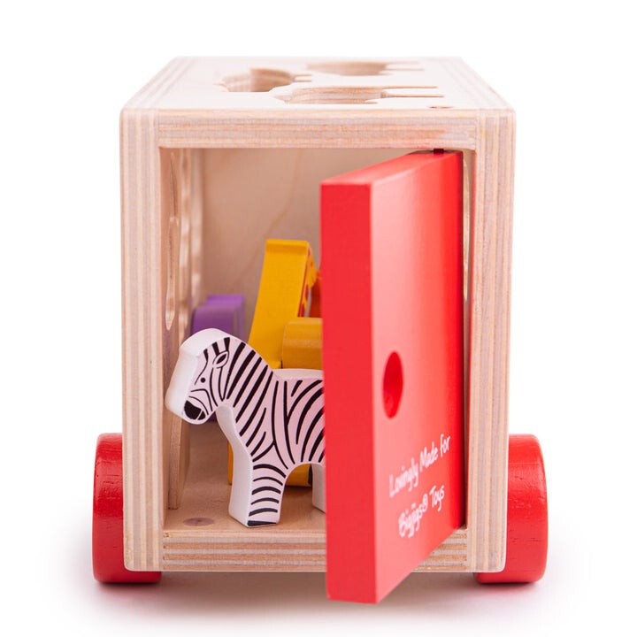 Who's ready for a safari? Hop aboard this Safari Sorting Toy Lorry and load the colourful wooden animals on via the special slots on the roof and side panels of the vehicle.